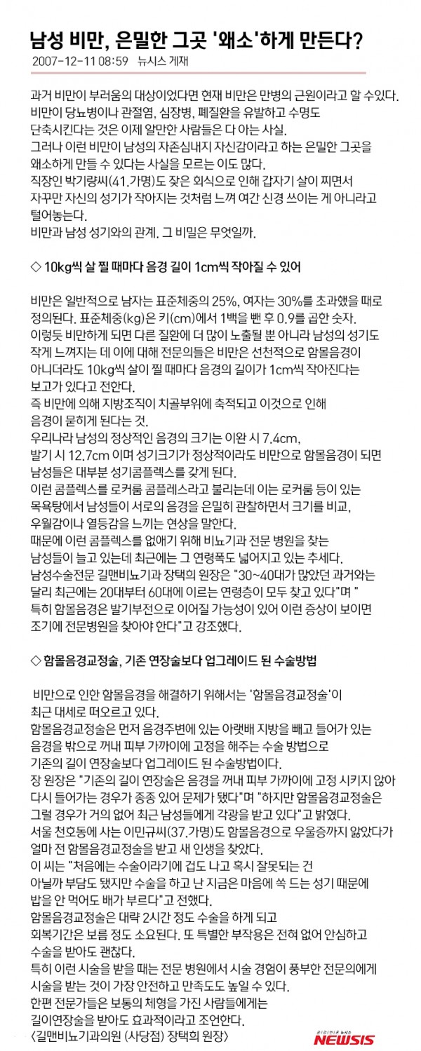 NO. 3 지점 작성일 2016.08.09 조회수 3,864 제목 남성비만, 은밀한 그곳 '왜소'하게 만든다? 관련링크 본문 2007년 12월 11일 뉴시스게제 이전글 다음글 목록보기